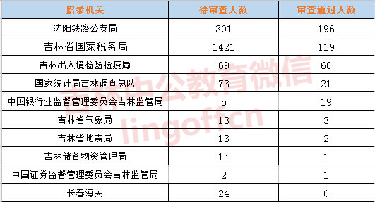 報名通過審核人數(shù)前十的職位主要集中在吉林省國家稅務(wù)局、吉林出入境檢驗檢疫局、沈陽鐵路公安局等部門,具體信息如下: