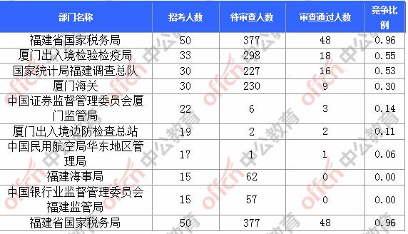 截止到30日18時,通過審核人數前三位的部門依次是:福建省國家稅務局、廈門出入境檢驗檢疫局、國家統計局福建調查總隊,三部門通過審核總人數達82人,占通過審核總人數的84.53%。