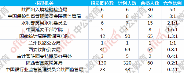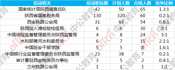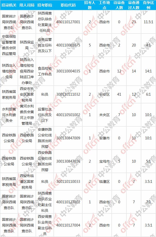 報(bào)名通過審核人數(shù)前十的職位主要集中在陜西出入境檢驗(yàn)檢疫局、國家統(tǒng)計(jì)局陜西調(diào)查總隊(duì)、西安鐵路公安局等部門,具體信息如下: