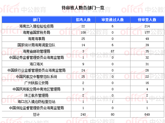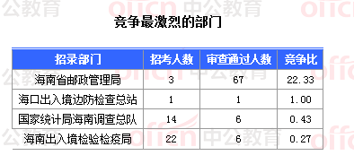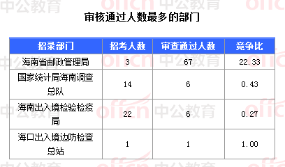 截止到30日18時,通過審核人數(shù)前三位的部門依次是:海南省郵政管理局、國家統(tǒng)計局海南調(diào)查總隊、海南出入境檢驗檢疫局,三部門通過審核總?cè)藬?shù)達(dá)79人,占通過審核總?cè)藬?shù)的98.75%。