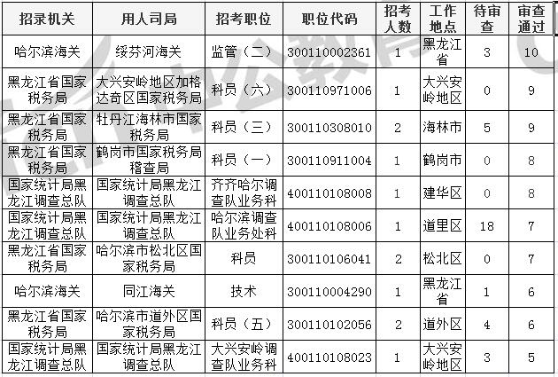 報名通過審核人數前十的職位主要集中在黑龍江省國家稅務局、哈爾濱海關、國家統計局黑龍江調查總隊等部門,具體信息如下:
