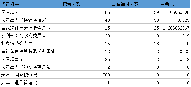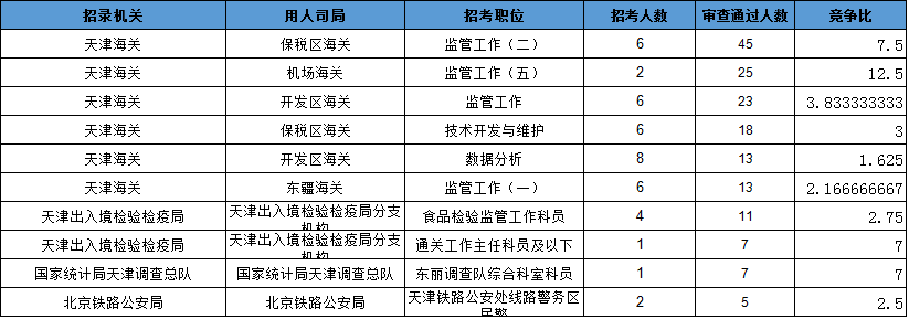報(bào)名通過審核人數(shù)前十的職位主要集中在天津海關(guān)、天津出入境檢驗(yàn)檢疫局等部門,具體信息如下: