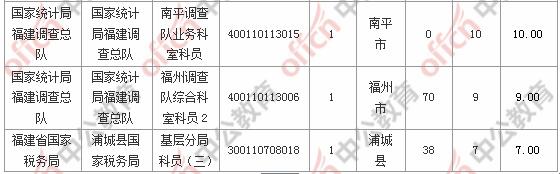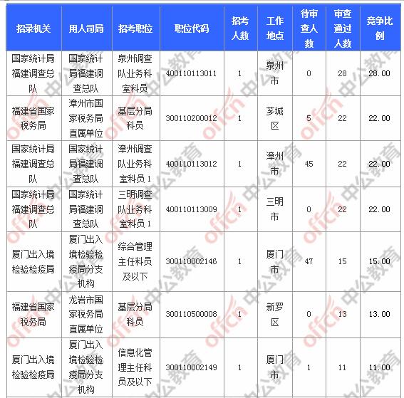 報名通過審核人數(shù)前十的職位主要集中在國家統(tǒng)計局福建調(diào)查總隊、福建省國家稅務(wù)局、廈門出入境檢驗檢疫局等部門,具體信息如下: