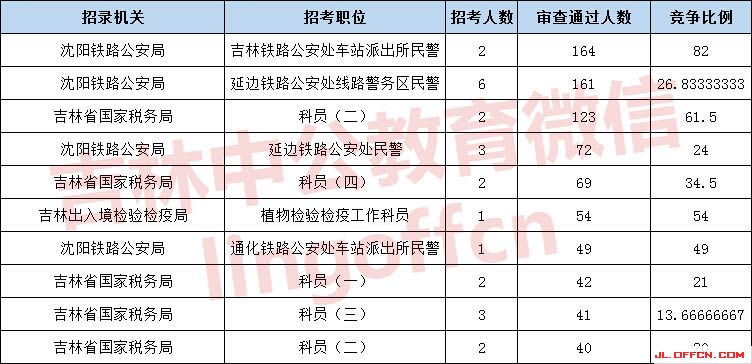 報名通過審核人數(shù)前十的職位主要集中在沈陽鐵路公安局、吉林國家稅務(wù)局、吉林出入境檢疫檢驗局等部門,具體信息如下: