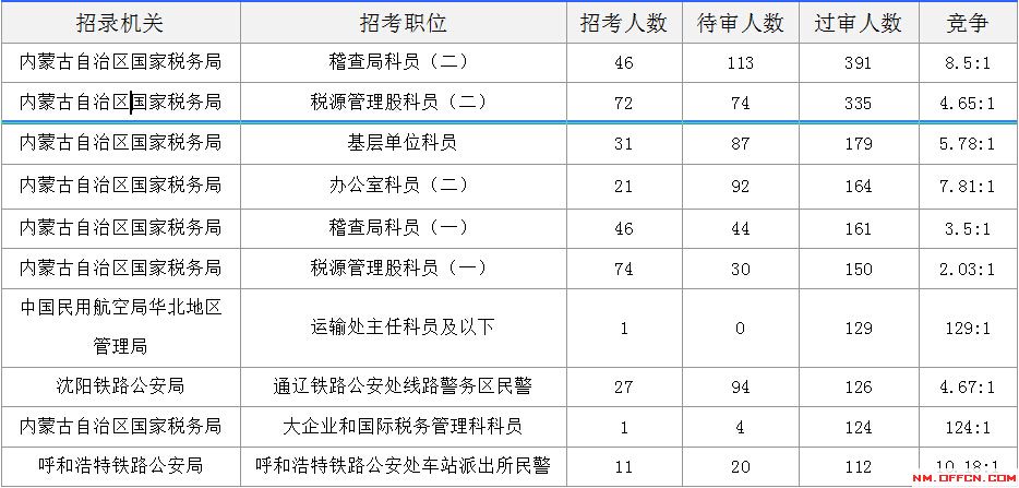 報(bào)名通過審核人數(shù)前十的職位主要集中在內(nèi)蒙古自治區(qū)國家稅務(wù)局,沈陽鐵路局、呼和浩特鐵路局以及中國民用航空局華北地區(qū)管理局等部門,具體信息如下: