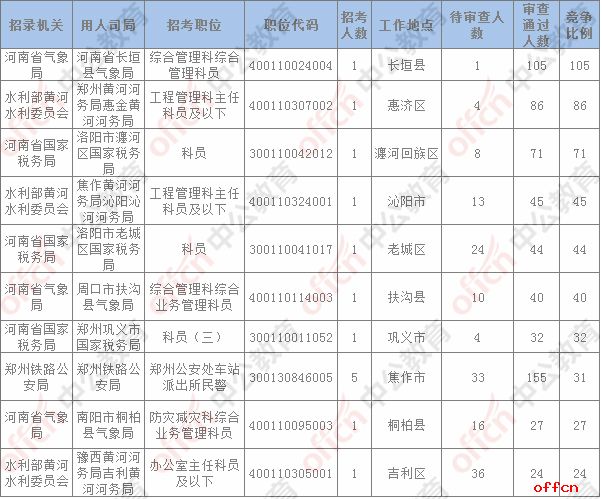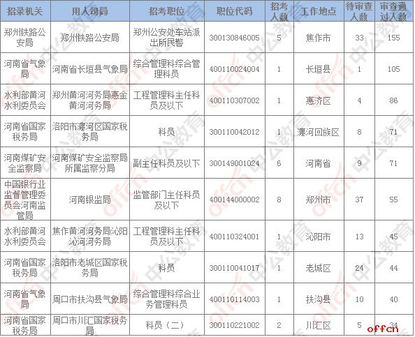 報名通過審核人數前十的職位主要集中在河南省國家稅務局、鄭州鐵路公安局、中國銀行業監督管理委員會河南監管局、水利部黃河水利委員會等部門,具體信息如下: