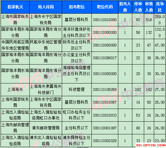 截止到1日9時,競爭比例的職位為上海市國家稅務局上海市長寧區國家稅務局基層分局科員一職,招錄2人,截止到1日9時通過人數為518人。報名通過審核人數前十的職位主要集中在上海市國家稅務局,上海海關,國家海洋局東海分局等部門,具體信息如下: