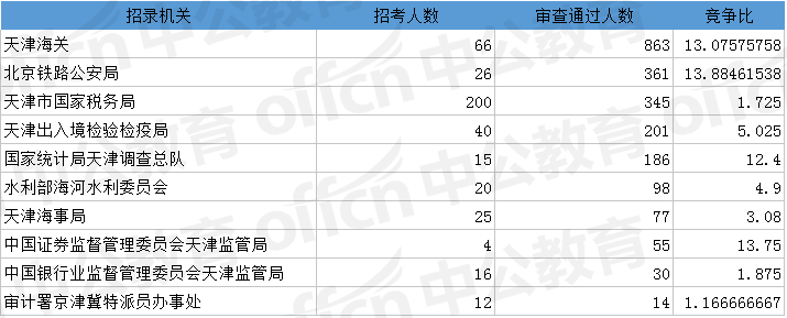 截止到1日16時(shí),通過審核人數(shù)前三位的部門依次是:天津海關(guān)、北京鐵路公安局、天津市國(guó)家稅務(wù)局,三部門通過審核總?cè)藬?shù)達(dá)1569人。
