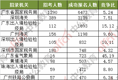 截至11月1日16時,據中公網校統計,國考職位中工作地點在廣東的職位通過審核總人數為18272人,共有365個職位無人通過審核,平均競爭比例為6.35:1。