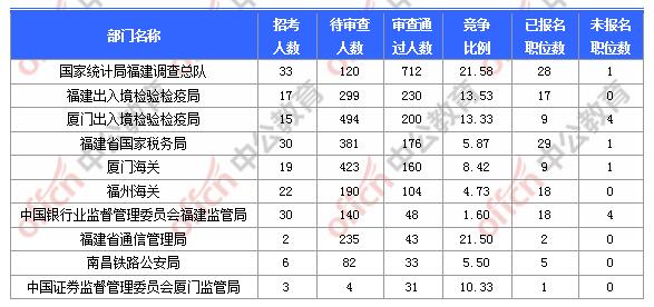 截止到1日16時,通過審核人數前三位的部門依次是:國家統計局福建調查總隊、福建出入境檢驗檢疫局、廈門出入境檢驗檢疫局,三部門通過審核總人數達1142人,占通過審核總人數的63.23%。