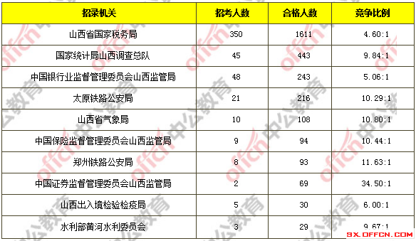 截至11月1日16時(shí),據(jù)中公網(wǎng)校統(tǒng)計(jì),國(guó)考職位中工作地點(diǎn)在山西的職位通過審核總?cè)藬?shù)為3009人,和去年同期相比合格人數(shù)減少了309人,截止目前共有44個(gè)職位無人報(bào)考,平均競(jìng)爭(zhēng)比例為5.67:1,和去年同期競(jìng)爭(zhēng)比基本持平。