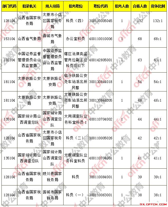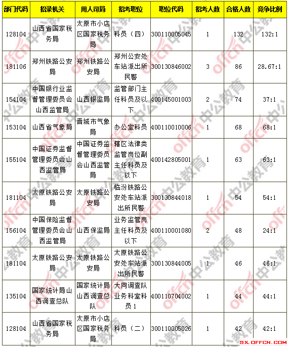 報(bào)名通過審核人數(shù)前十的職位主要集中在山西省國(guó)家稅務(wù)局、鄭州鐵路公安局、中國(guó)銀行業(yè)監(jiān)督管理委員會(huì)山西監(jiān)管局等部門,具體信息如下:
