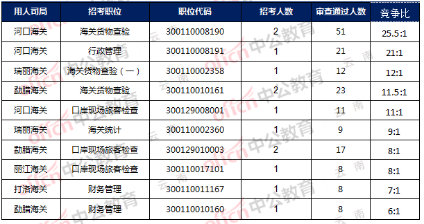 2018國家公務員海關報名人數截止11月1日河口海關,職位代碼:300110008190,招錄2人,審查通過人數為51人,暫時競爭比為25.5:1,具體信息如下: