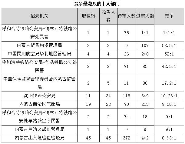 截至11月1日16時,據中公網校統計,國考職位中工作地點在內蒙古的職位通過審核總人數為6326人,待審人數為3775人,報名總人數已破萬,共有65個職位無人報考,平均競爭比例為7.33:1。