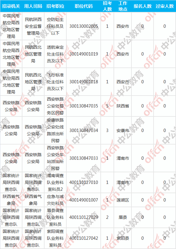 截至到2日9時,工作地點在陜西的職位共有10個無人報考,占全部職位的3.48%。下面是無人報考職位一覽表,中公網校專家建議廣大考生多關注一些較冷職位,避免激烈競爭,結合自身條件,找到屬于自己的職位。