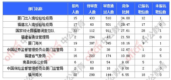 截止到2日9時,通過審核人數前三位的部門依次是:國家統計局福建調查總隊、門出入境檢驗檢疫局、福建出入境檢驗檢疫局,三部門通過審核總人數達1922人,占通過審核總人數的61.03%。