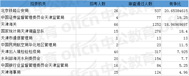 截止到2日16時,通過審核人數前三位的部門依次是:天津海關、天津市國家稅務局、北京鐵路公安局,三部門通過審核總人數達2391人。