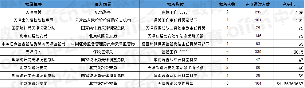 報名通過審核人數前十的職位主要集中在天津海關、北京鐵路公安局、天津出入境檢驗檢疫局等部門,具體信息如下: