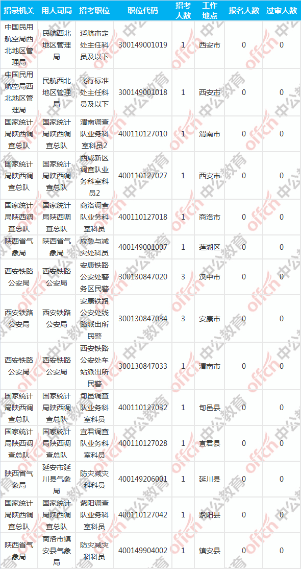 截至到2日16時,工作地點在陜西的職位共有14個無人報考,占全部職位的4.87%。下面是無人報考職位一覽表,中公網(wǎng)校專家建議廣大考生多關(guān)注一些較冷職位,避免激烈競爭,結(jié)合自身條件,找到屬于自己的職位。