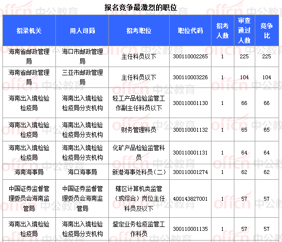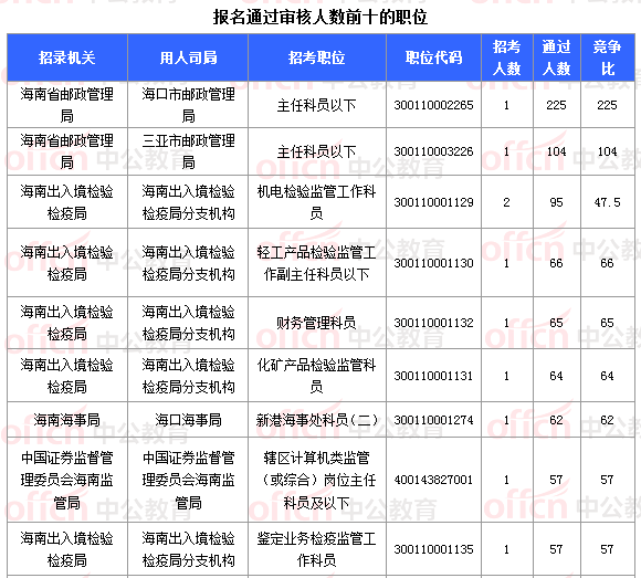 報(bào)名通過審核人數(shù)前十的職位主要集中在海南省郵政管理局、海南出入境檢驗(yàn)檢疫局、海南海事局等部門,具體信息如下:
