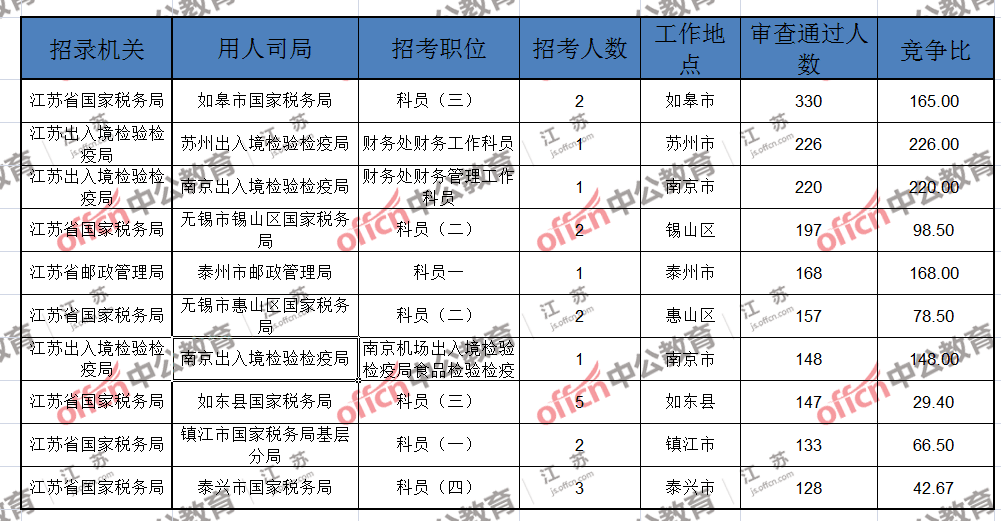 報名通過審核人數前十的職位主要集中在江蘇出入境檢驗檢疫局、江蘇省郵政管理局、江蘇省國家稅務局等部門,具體信息如下:
