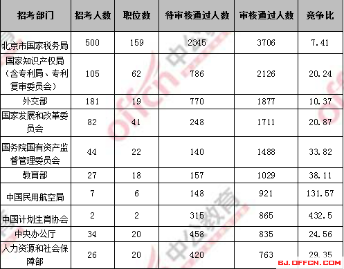 本次國考,北京國稅是北京地區招錄人數最多的部門,共招錄500人,目前審核通過的人數為3906人,待審核人數為2345,競爭比為7:1,這也能看得出考生對于學生對于國稅的喜愛。在報名最多的10個部門中,由于大部分中央部門都在北京,所以這也是北京整體報考人數較多的原因。