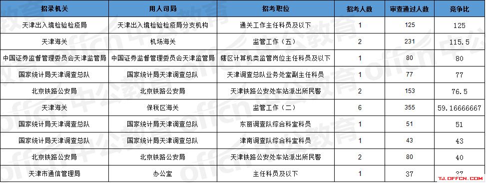 報名通過審核人數前十的職位主要集中在天津海關、北京鐵路公安局、天津出入境檢驗檢疫局等部門,具體信息如下: