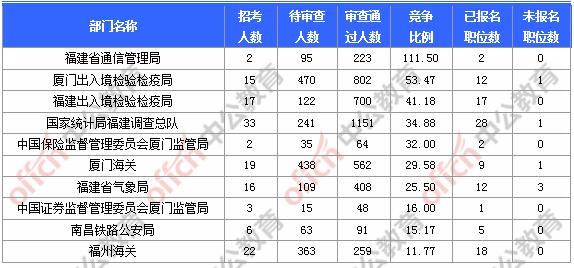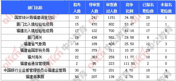 截止到3日9時,通過審核人數(shù)前三位的部門依次是:國家統(tǒng)計局福建調(diào)查總隊、廈門出入境檢驗檢疫局、福建出入境檢驗檢疫局,三部門通過審核總?cè)藬?shù)達(dá)2653人,占通過審核總?cè)藬?shù)的52.79%。