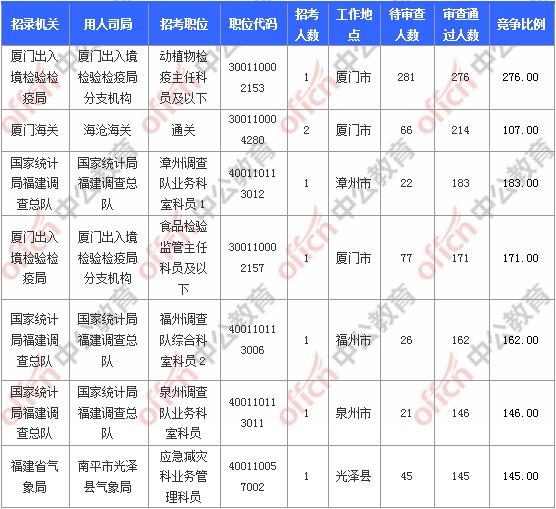 截止到3日16時,競爭比例的職位為廈門出入境檢驗檢疫局廈門出入境檢驗檢疫局分支機構動植物檢疫主任科員及以下300110002153一職,招錄1人,截止到3日9時通過人數為276人,競爭比例276:1!