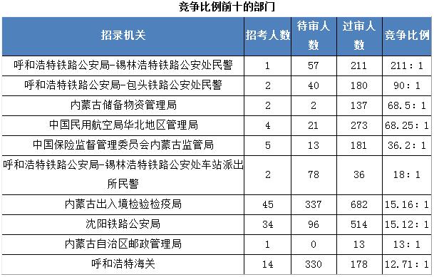 競爭比例的部門為呼和浩特鐵路公安局-錫林浩特鐵路公安處民警,招錄1人,截至到2017年11月2日16時,過審人數為211人,其次是包頭鐵庫公安處民警,招錄2人,過審人數為180人。