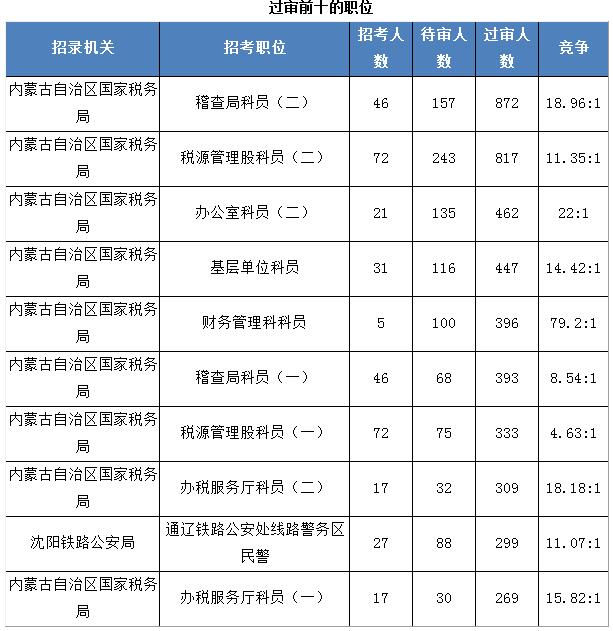 通過審核人數最多的前十個職位中內蒙自治區國家稅務局占了9席,其中稽查局科員(二)、 通過審核人數為872人,管理股科員(二)審核人數為817人,競爭比例分別為18.96:1與11.35:1.具體信息如下: