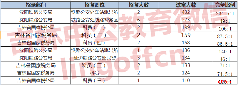 報名通過審核人數前十的職位主要集中在沈陽鐵路公安局、吉林國家稅務局、吉林出入境檢疫檢驗局等部門,具體信息如下: