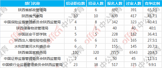 截至到3日16時,通過審核人數前三位的部門依次是:陜西省國家稅務局、西安鐵路公安局、國家統計局陜西調查總隊,三部門通過審核總人數達7581人,占通過審核總人數的77.3%。