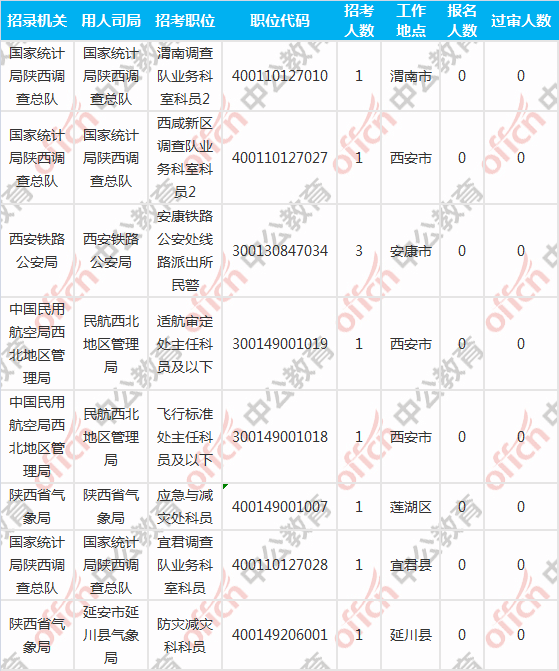 截至到3日16時(shí),工作地點(diǎn)在陜西的職位共有8個(gè)無人報(bào)考,占全部職位的2.79%。下面是無人報(bào)考職位一覽表,中公網(wǎng)校建議廣大考生多關(guān)注一些較冷職位,避免激烈競(jìng)爭(zhēng),結(jié)合自身?xiàng)l件,找到屬于自己的職位。