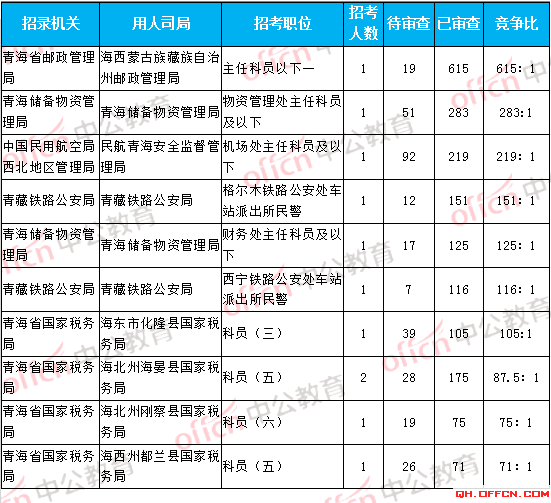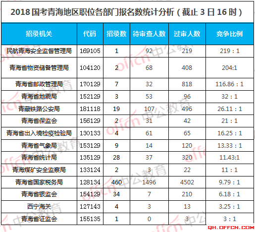 以下是3日16時各部門報名人數(shù)統(tǒng)計分析,其中中國民航青海安全監(jiān)督管理局、青海省物資儲備管理局、青海省郵政管理局等三個部門競爭最激烈,競爭比均超過116:1。