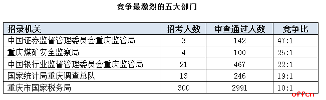 為幫助廣大考生更清晰的了解今日報名情況,中公網校整理了審核通過人數前五的部門以及競爭比例最激烈的五大部門,供廣大考生參考: