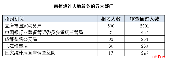 截止到3日16時,通過審核人數前三位的部門依次是:重慶市國家稅務局、中國銀行業監督管理委員會重慶監管局、成都鐵路公安局,三部門通過審核總人數達3722人,占通過審核總人數的81%。