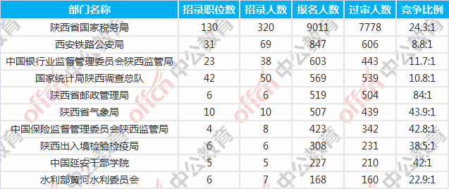 截至到4日9時,通過審核人數(shù)前三位的部門依次是:陜西省國家稅務(wù)局、西安鐵路公安局、國家統(tǒng)計局陜西調(diào)查總隊,三部門通過審核總?cè)藬?shù)達(dá)8923人,占通過審核總?cè)藬?shù)的77.6%。