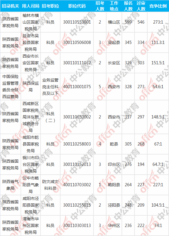 報名人數(shù)前十的職位主要集中在陜西省國家稅務(wù)局、中國保險監(jiān)督管理委員會陜西監(jiān)管局、陜西省氣象局等部門,具體信息如下: