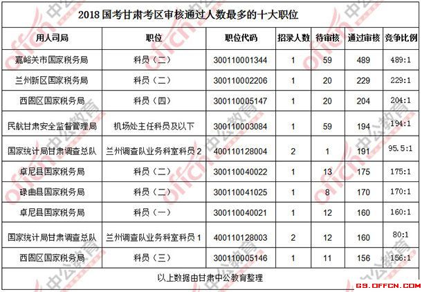 報(bào)名通過審核人數(shù)前十的職位主要集中在嘉峪關(guān)市國(guó)家稅務(wù)局、蘭州新區(qū)國(guó)家稅務(wù)局、西固區(qū)國(guó)家稅務(wù)局等部門,具體信息如下: