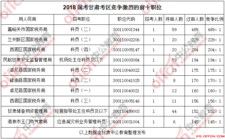 11月4日16時(shí),競(jìng)爭(zhēng)比例的職位為甘肅省國(guó)家稅務(wù)局嘉峪關(guān)市國(guó)家稅務(wù)局科員(二)一職,招錄1人,11月4日16時(shí)通過人數(shù)為489人,競(jìng)爭(zhēng)比例為489:1!