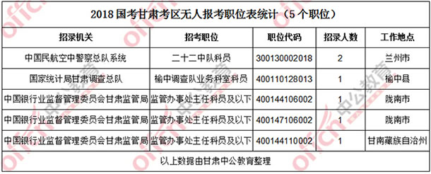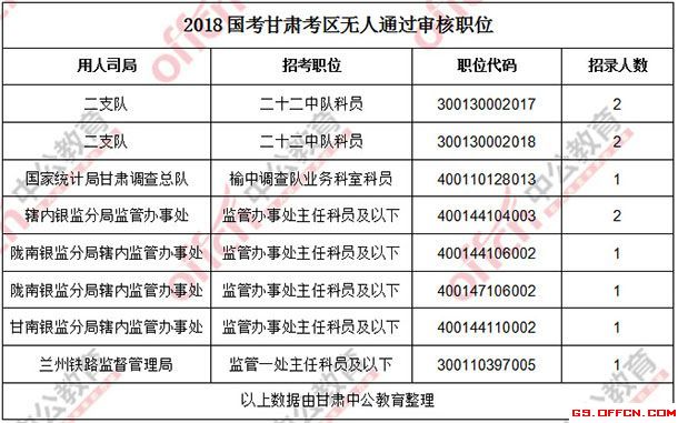 11月4日16時,工作地點在甘肅的職位共有8個職位無人通過審核,占全部職位的3.7%,5個職位無人報考,占全部職位的2.3%。下面是無人待審及無人報報職位一覽表,中公網校專家建議廣大考生多關注一些較冷職位,避免激烈競爭,結合自身條件,找到屬于自己的職位。