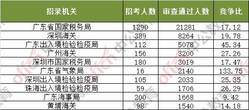 截止到4日16時,通過審核人數(shù)前三位的部門依次是:廣東省國家稅務(wù)局、深圳海關(guān)、廣東出入境檢驗檢疫局,三部門通過審核總?cè)藬?shù)達27454人,占通過審核總?cè)藬?shù)的61.2%。
