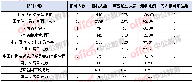 競爭比例(=審查通過人數/報考人數)排名前三位的部門依次是:湖南儲備物資管理局(競爭比例為139:1)、國家統計局湖南調查總隊(競爭比例為52.05:1)和湖南省郵政管理局(競爭比例為45:1)。