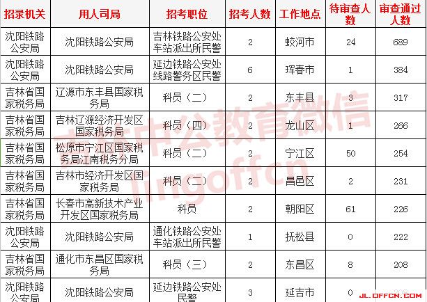 報名通過審核人數前十的職位主要集中在沈陽鐵路公安局、吉林國家稅務局、吉林出入境檢疫檢驗局等部門,具體信息如下: