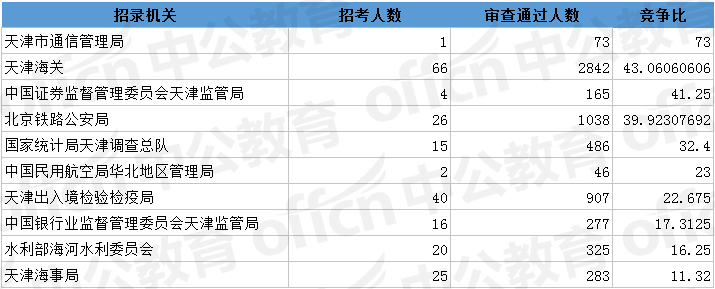 為幫助廣大考生更清晰的了解今日報名情況,中公網校整理了審核通過人數前十位的部門以及競爭比例最激烈的十大部門,供廣大考生參考: