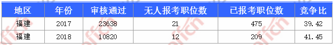 截至11月5日16時,據中公網校統計,國考職位中工作地點在福建的職位3009人待審,10820人通過審核,共報名13829人,其中有11個職位無人報名,平均競爭比例為41.45:1。