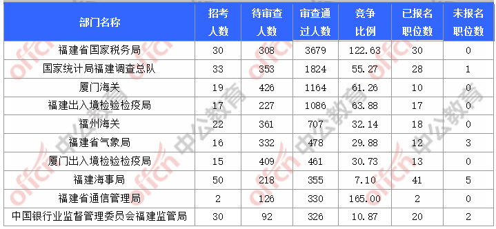 報名通過審核人數前十的職位主要集中在福建省國家稅務局、廈門海關、國家統計局福建調查總隊等部門,具體信息如下: