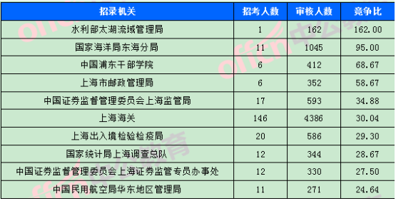 截至11月5日16時,據(jù)中公網(wǎng)校統(tǒng)計,國考職位中工作地點在上海的職位報名總人數(shù)17248人,通過審核總人數(shù)為14254人,最熱職位競爭比例為715:1,平均競爭比例為19.08:1。