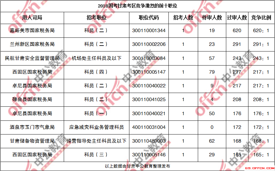 報名通過審核人數(shù)前十的職位主要集中在嘉峪關(guān)市國家稅務(wù)局、蘭州新區(qū)國家稅務(wù)局、西固區(qū)國家稅務(wù)局等部門,具體信息如下: